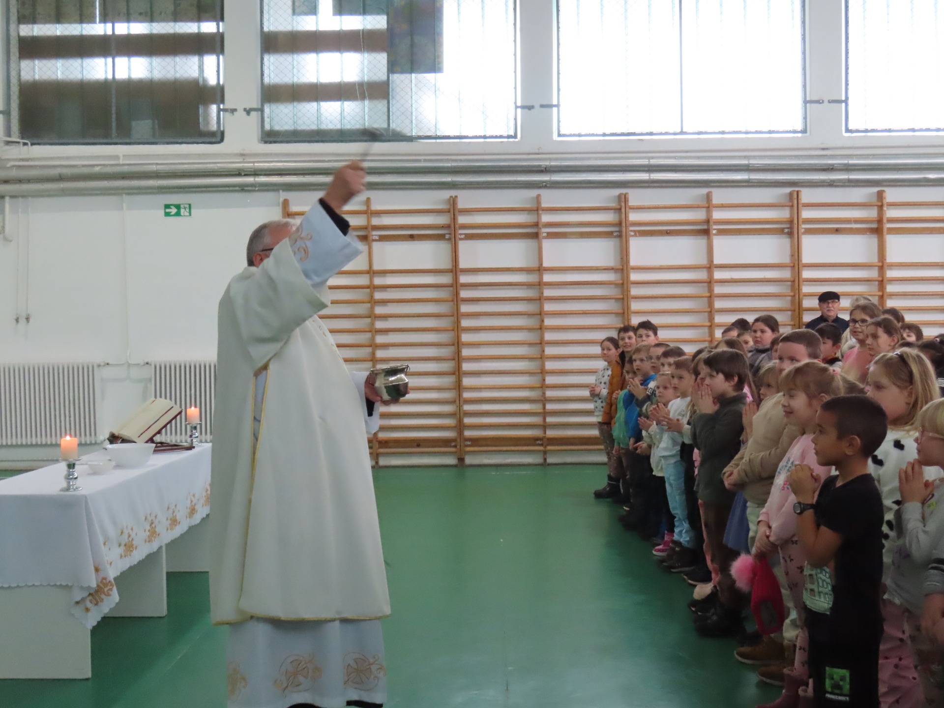Október 10-én terményáldás során adtunk hálát a megtermett javainkért, a termelők munkájáért. Az osztályok zöldségekkel, gyümölcsökkel, termésekkel megrakott kosarakat helyeztek az oltárra, amelyeket Imre atya megáldott, majd a liturgia után a frissen fogyasztható terményeket jóízűen megették a gyerekek.