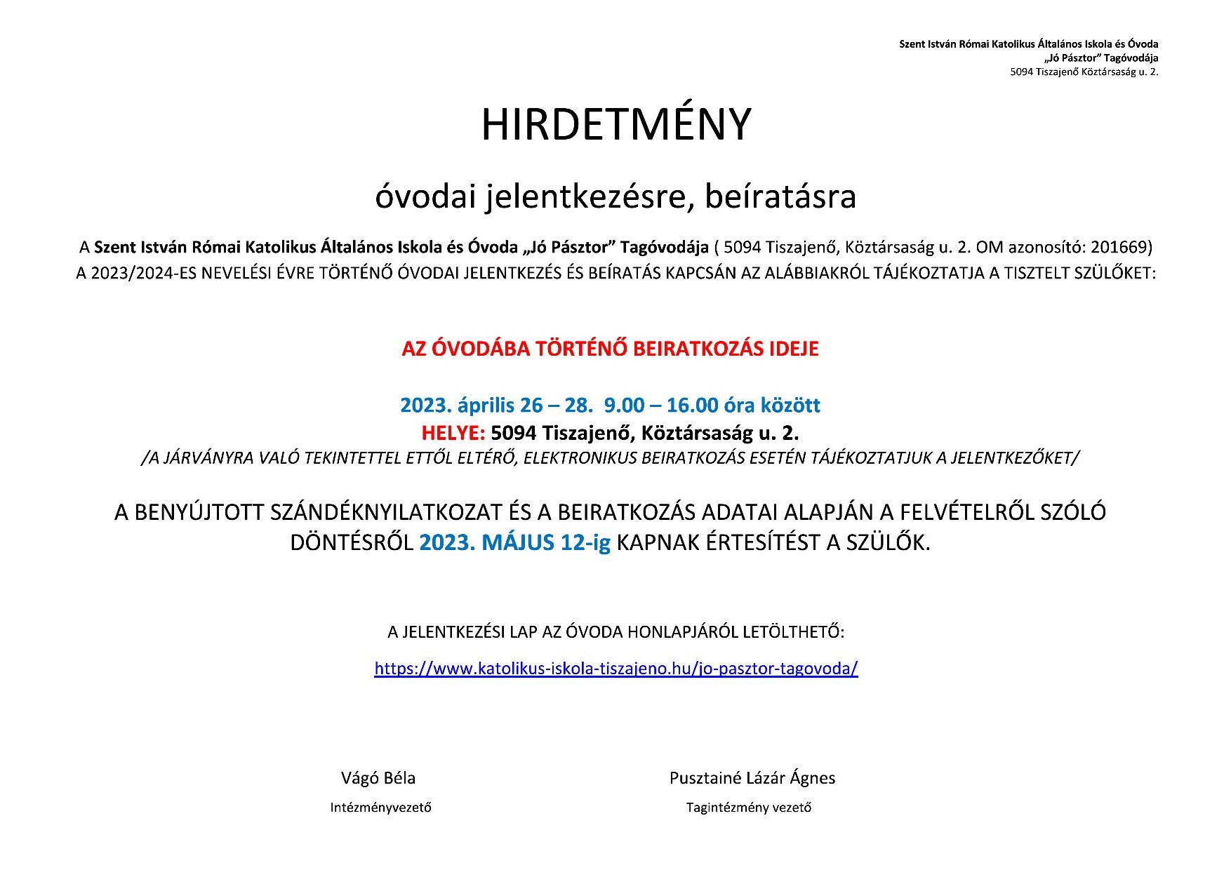 A beíratáshoz szükséges tájékoztató és jelentkezési lapok megtalálhatók a HIRDETMÉNYRE vagy IDE kattintva.