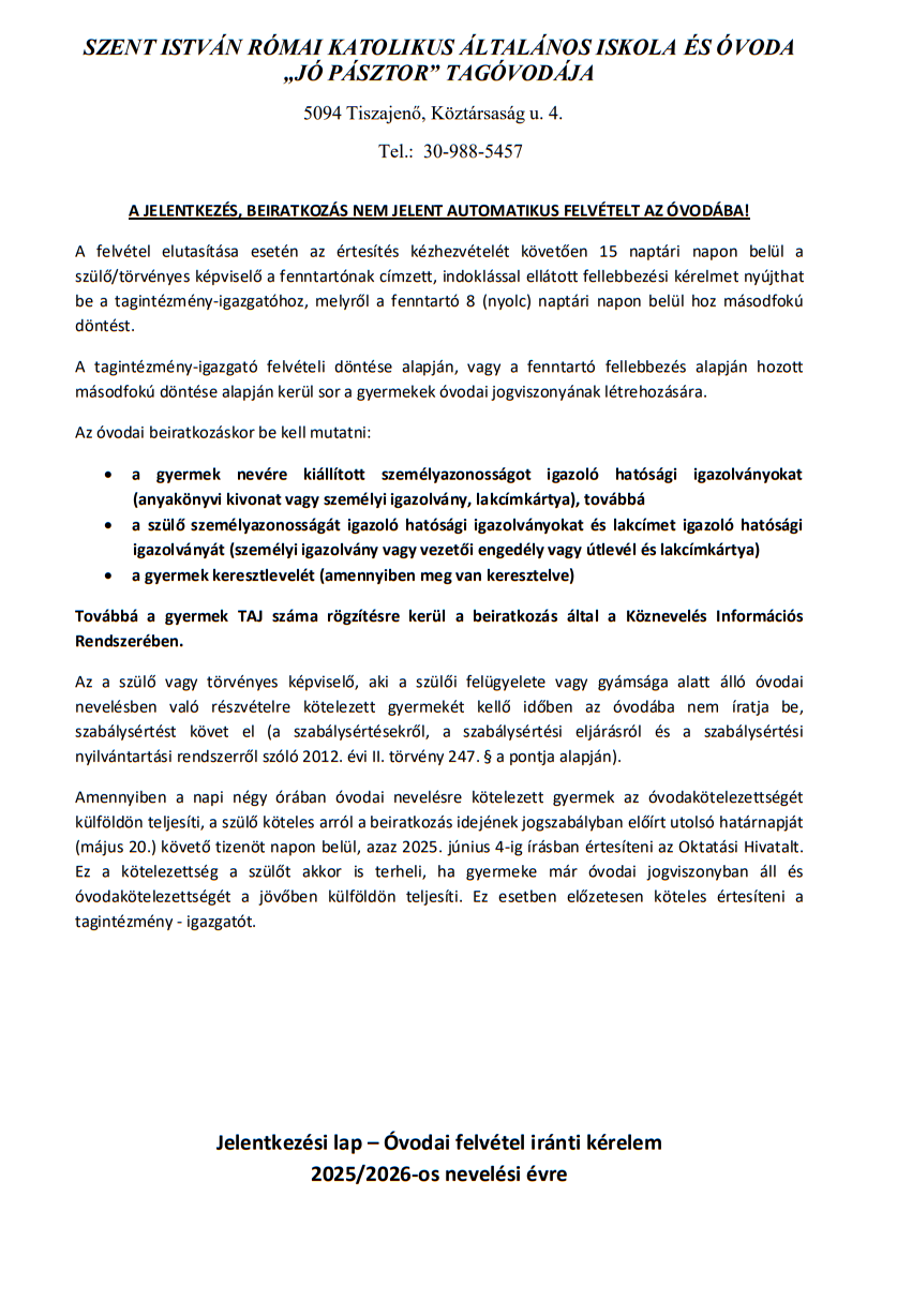 a tiszajenői , Jó Pásztor Római Katolikus Óvoda ............................ csoportos gyermekének törvényes képviselője aláírásommal igazolom, hogy az EMMI által kiadott "Intézkedési terv a 2020/2021. Tanévben a köznevelési intézményekben a járványügyi készenlét idején alkalmazandó eljárásrendről" dokumentumot, és az az alapján készített, gyermekem óvodájára vonatkozó INTÉZKEDÉSI TERVET A JÁRVÁNYÜGYI KÉSZENLÉT IDEJÉN ALKALMAZANDÓ ELJÁRÁSRENDRŐL megismertem, a benne foglaltakat tudomásul vettem, gyermekemre és a szülőre vonatkozó szabályozást betartom.