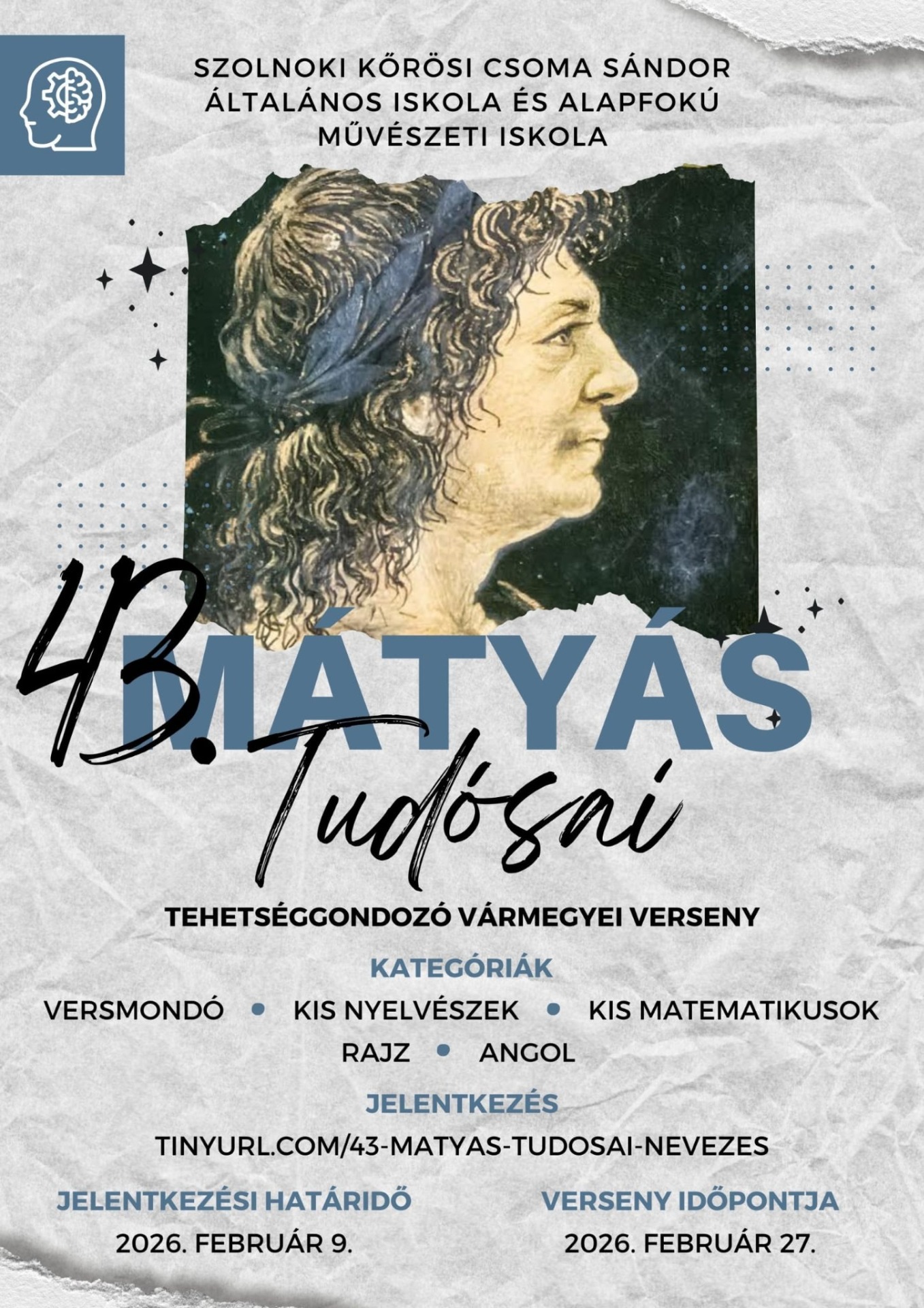 Iskolánk diákjai idén is részt vettek a szolnoki Kőrösi Csoma Sándor Iskola által meghirdetett "Mátyás tudósai" versenyen. A rangos megmérettetésen több korosztályban és több kategóriában képviselték intézményünket tanulóink. A szavalóversenyen két nyolcadikos, Kupecz Kitti és Fehér Emma indult a 7–8. évfolyamosok összevont mezőnyében. Mindketten szépen szerepeltek az erős mezőnyben: Kitti a 11. helyen, Emma pedig a 8. helyen végzett. A harmadik évfolyamból négy diákunk vállalta a kihívást. A rajzversenyen Török Alíz Fanni és Ungor Levente mutathatták meg tehetségüket. Nagyon igényes, kreatív alkotásokat készítettek, munkáik méltán kerülhettek a pályaművek közé. A matematika versenyen Terjéki Marcell és Szijj Boldizsár mérte össze tudását a többi indulóval. Boldizsár a 15., Marcell pedig a 19. helyen végzett. Büszkék vagyunk minden résztvevőnkre, és ezúton is gratulálunk nekik a szép eredményekhez!